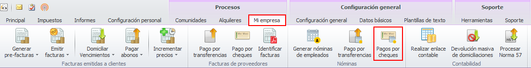 Se accede mediante el botón Pago por cheques del apartado Nóminas de empleados que se puede encontrar en el menú Procesos/Mi empresa.