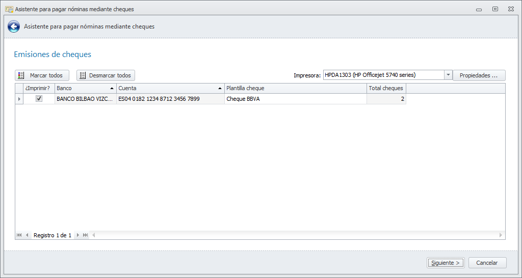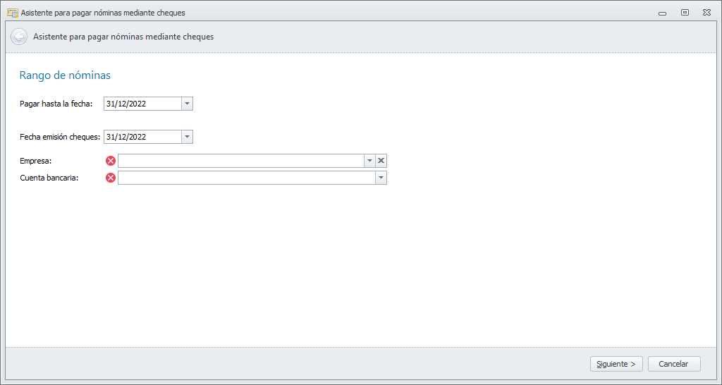 Se abre un asistente que le guiará durante el proceso. Escoja la empresa y cuenta bancaria desde la que emitirá los cheques y la fecha de emisión, que será también la de contabilización del pago.