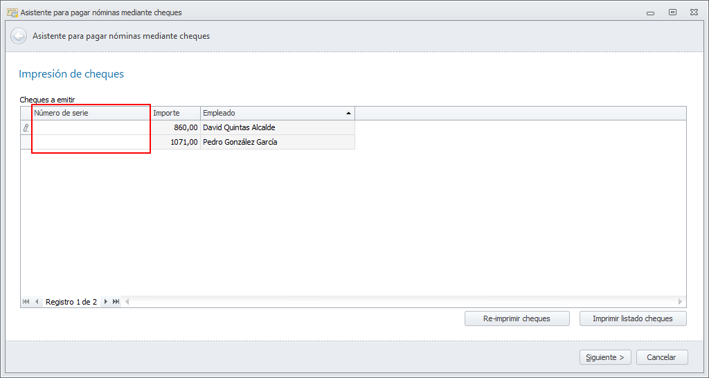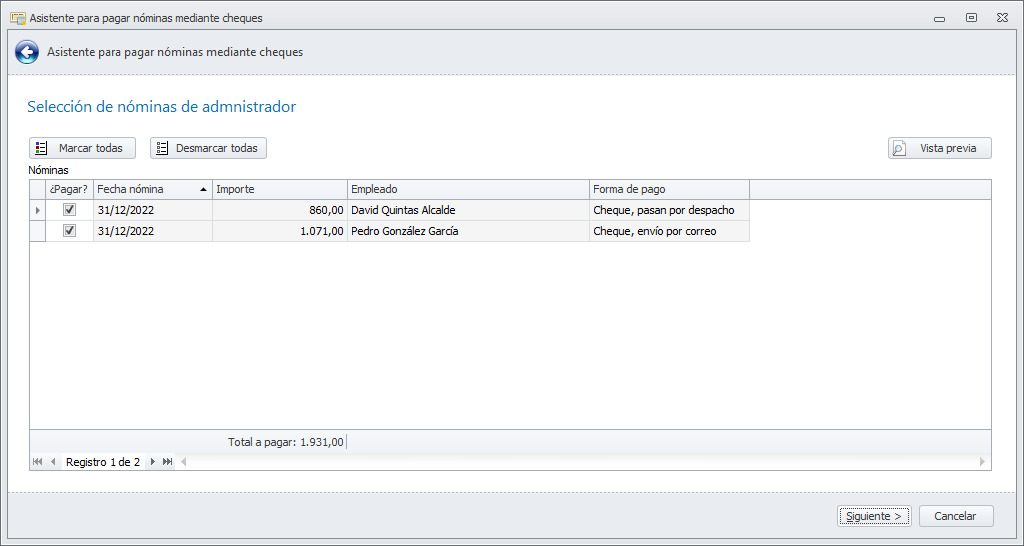 Haga clic en Siguiente. El programa selecciona y muestra las nóminas pendientes de pago cuya fecha es menor o igual a la de la casilla Pagar hasta fecha y cuya forma de pago es Cheque, envío por correo o Cheque, pasan por despacho.