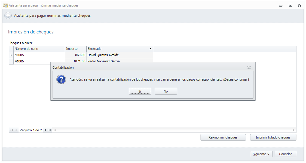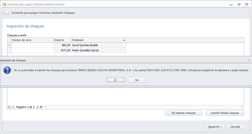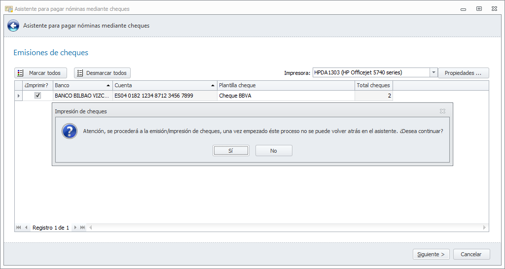 A continuación, muestra un mensaje para que confirme que tiene el papel de cheques puesto en al impresora para la primera de las cuentas bancarias. Al contestar Sí, se inicia la impresión.
