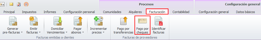 Se accede mediante el botón Pago por cheques del apartado Facturas de proveedores que se puede encontrar en el menú Procesos/Facturación.