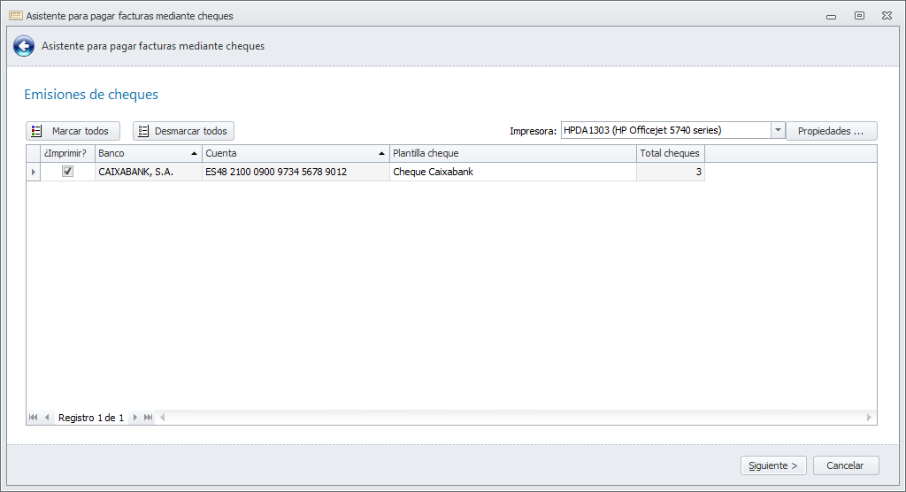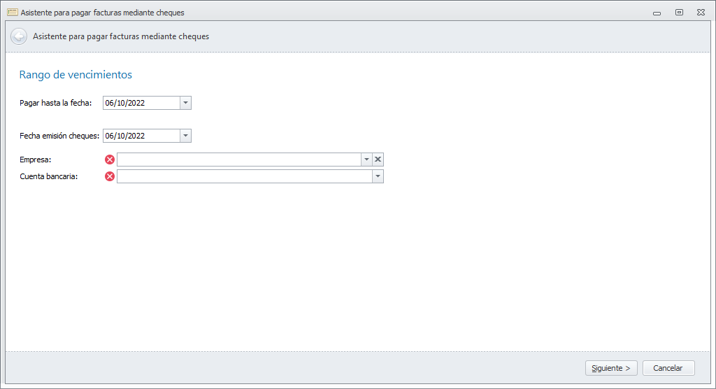 Se abre un asistente que le guiará durante el proceso. Escoja la fecha máxima de vencimientos a pagar, la empresa y cuenta bancaria desde la que emitirá los cheques y la fecha de emisión, que será también la de contabilización del pago.