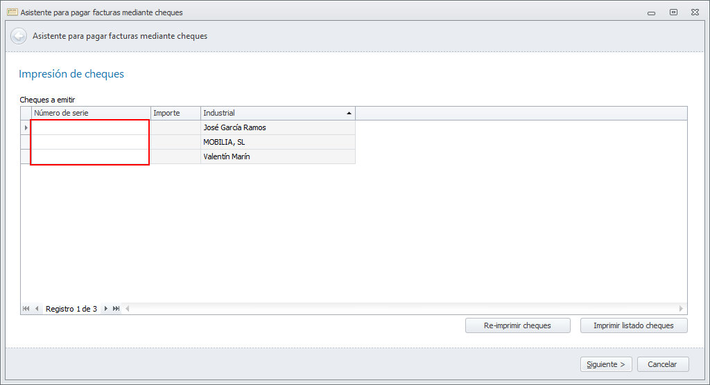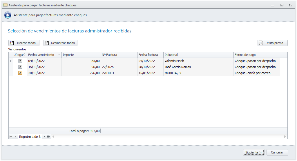 Haga clic en Siguiente. El programa selecciona y muestra las facturas pendientes de pago cuya fecha es menor o igual a la de la casilla Pagar hasta fecha y cuya forma de pago es Cheque, envío por correo o Cheque, pasan por despacho.