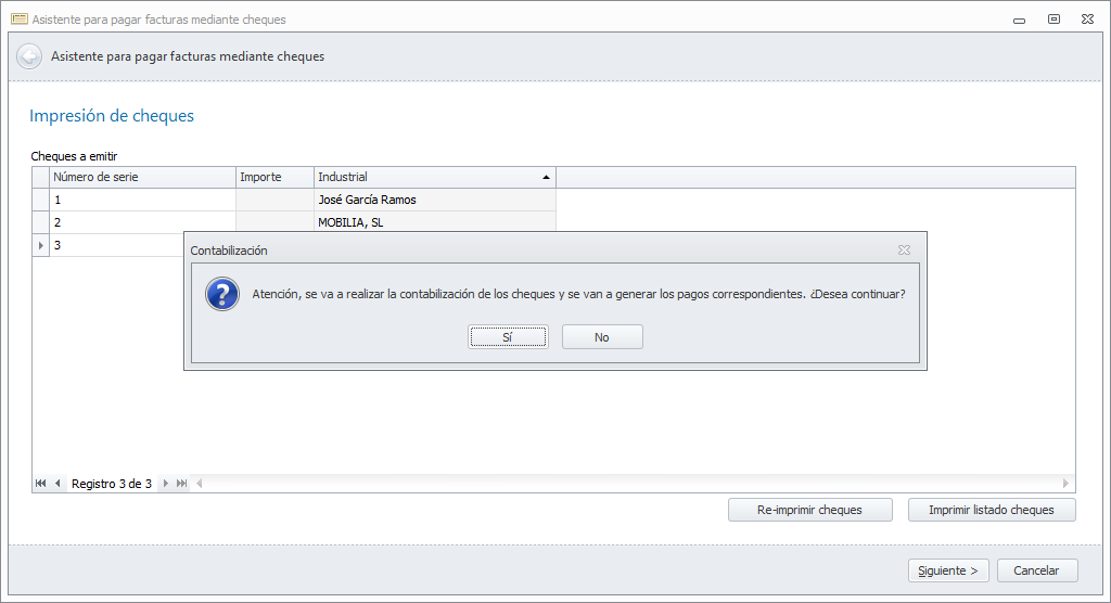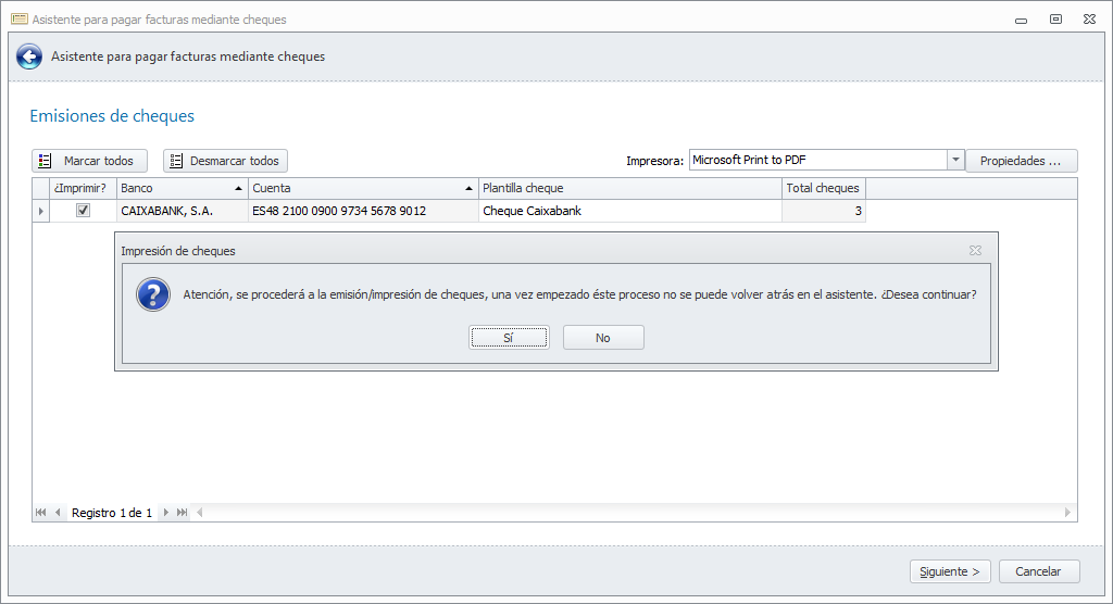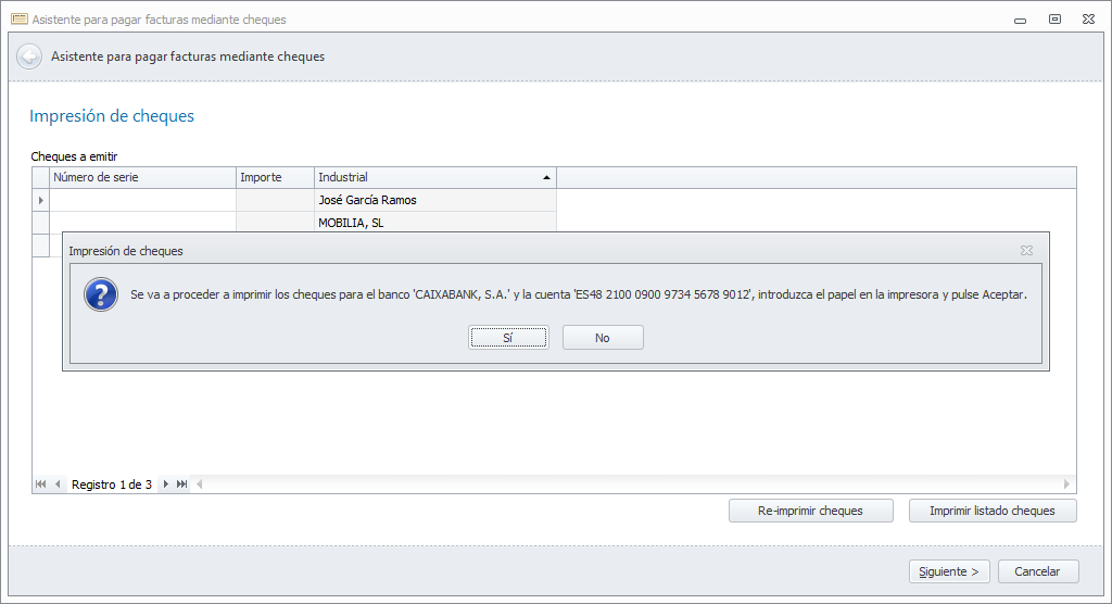 A continuación, muestra un mensaje para que confirme que tiene el papel de cheques puesto en al impresora para la primera de las cuentas bancarias. Al contestar Sí, se inicia la impresión.