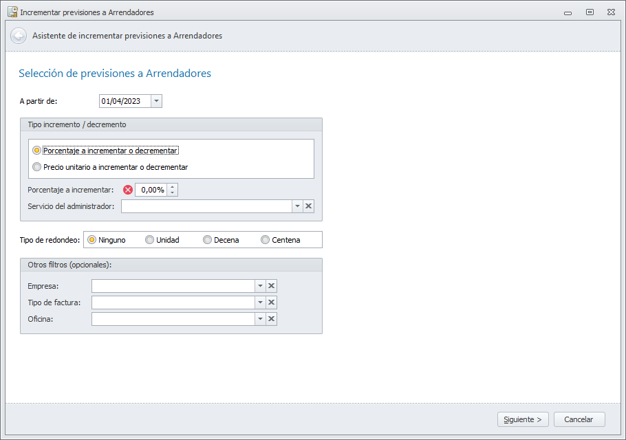 Empresa. Si escoge una empresa, se procesará el incremento sólo sobre los arrendadores y perceptores administrados por esa empresa. Si deja la casilla vacía, no se realiza filtrado por empresa.