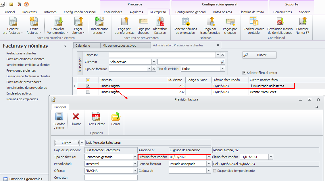 A partir de: Escoja la fecha a partir de la cuál desea incrementar las previsiones. El proceso tendrá en cuenta aquellas previsiones cuya fecha de próxima emisión sea igual o superior a la introducida en pantalla.