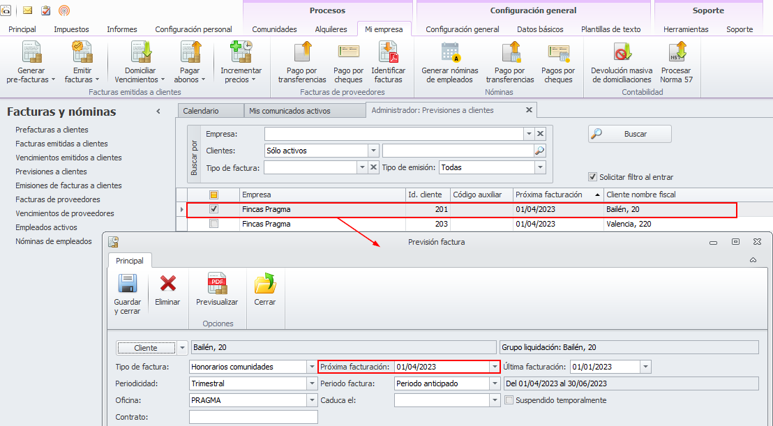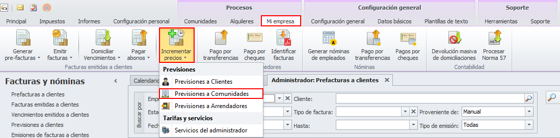 Para incrementar precios de previsiones de comunidades, vaya al menú Procesos / Mi empresa, haga clic en el botón Incrementar precios y escoja Previsiones a Comunidades.