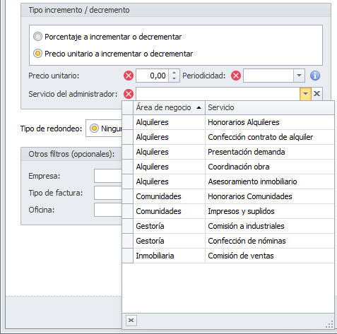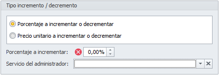 Servicio del administrador. Debe escoger un servicio sobre el que realizar el incremento. Se ejecutará únicamente para ese servicio en las previsiones que cumplan con los demás criterios de selección. Si escoge Precio unitario a incrementar o decrementar, no se permite dejar esta casilla vacía.