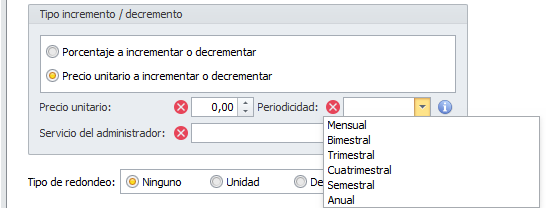 Si escoge Precio unitario a incrementar o decrementar, se solicita el importe a incrementar y su periodicidad. En caso de introducir un valor negativo, el precio se decrementará en lugar de incrementarse. El valor del precio se entiende asociado a la periodicidad escogida y se ajusta al número de meses de la periodicidad de la previsión. Es decir, se calcula el precio a incrementar mensualmente y se multiplica por el número de meses de la periodicidad de la previsión.
