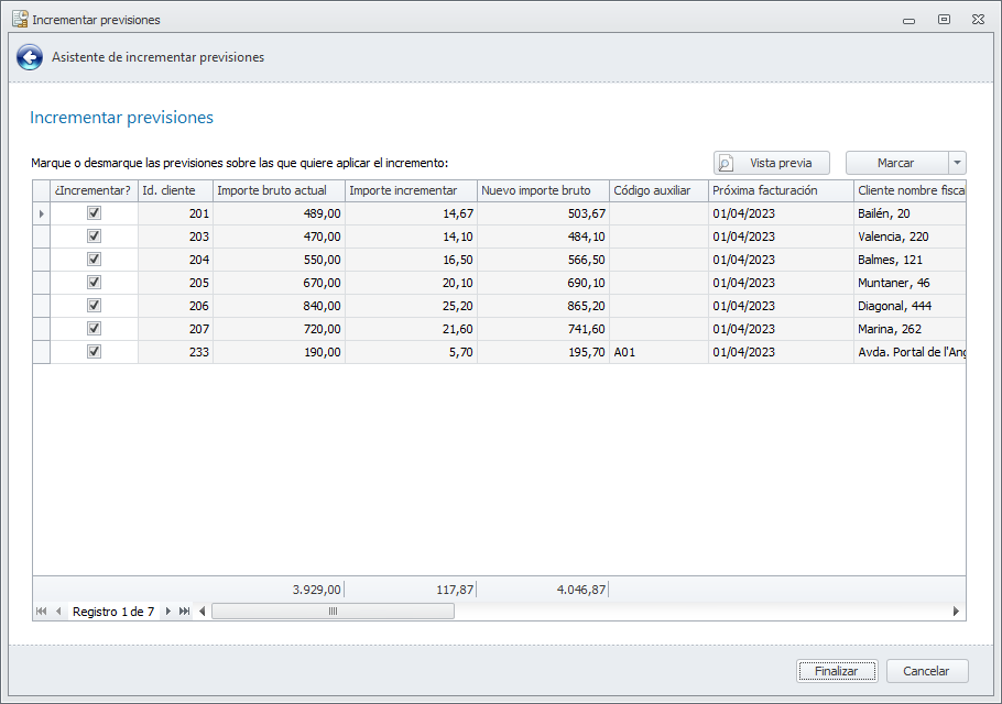 La segunda ventana del asistente localiza las previsiones que cumplen con los requisitos indicados en la primera ventana y muestra el resultado de los incrementos que se realizarán.