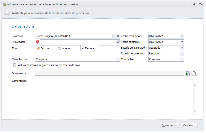 Proveedor: Identifica al proveedor emisor de la factura. Si no existe puede darse de alta desde este mismo punto, antes de continuar con la introducción de la factura.