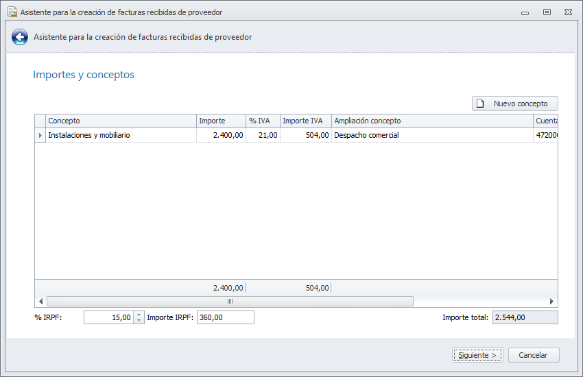 Si necesita entrar más líneas haga clic en Nuevo concepto. Si no, haga clic en Siguiente.