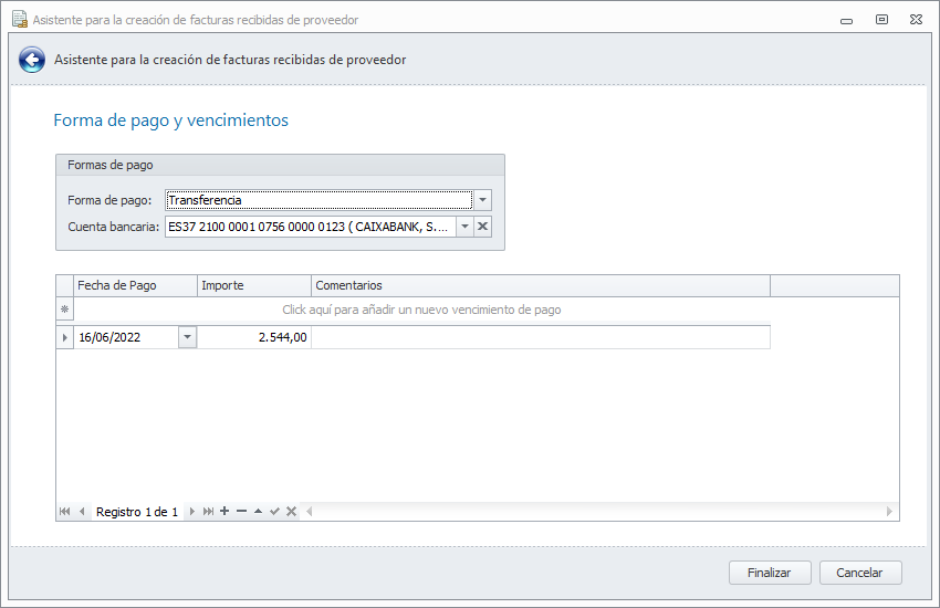 En función de las condiciones de pago establecidas en la ficha del proveedor, se calcularán los vencimientos de esta factura. Haga clic aquí para más información.