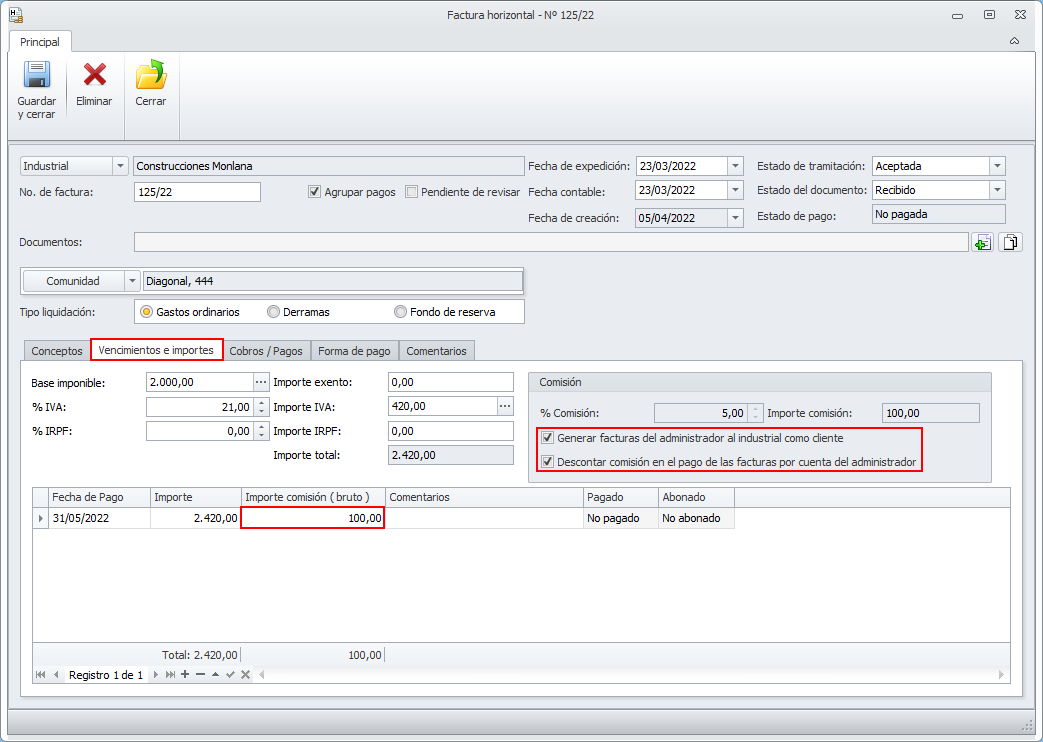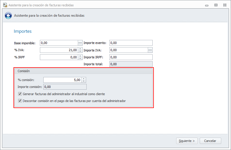 Cada vez que registre una nueva factura de industrial, se copiarán sobre ella los valores relativos a la comisión desde la ficha del industrial. El usuario podrá cambiar y personalizar estos valores para cada factura si es necesario.