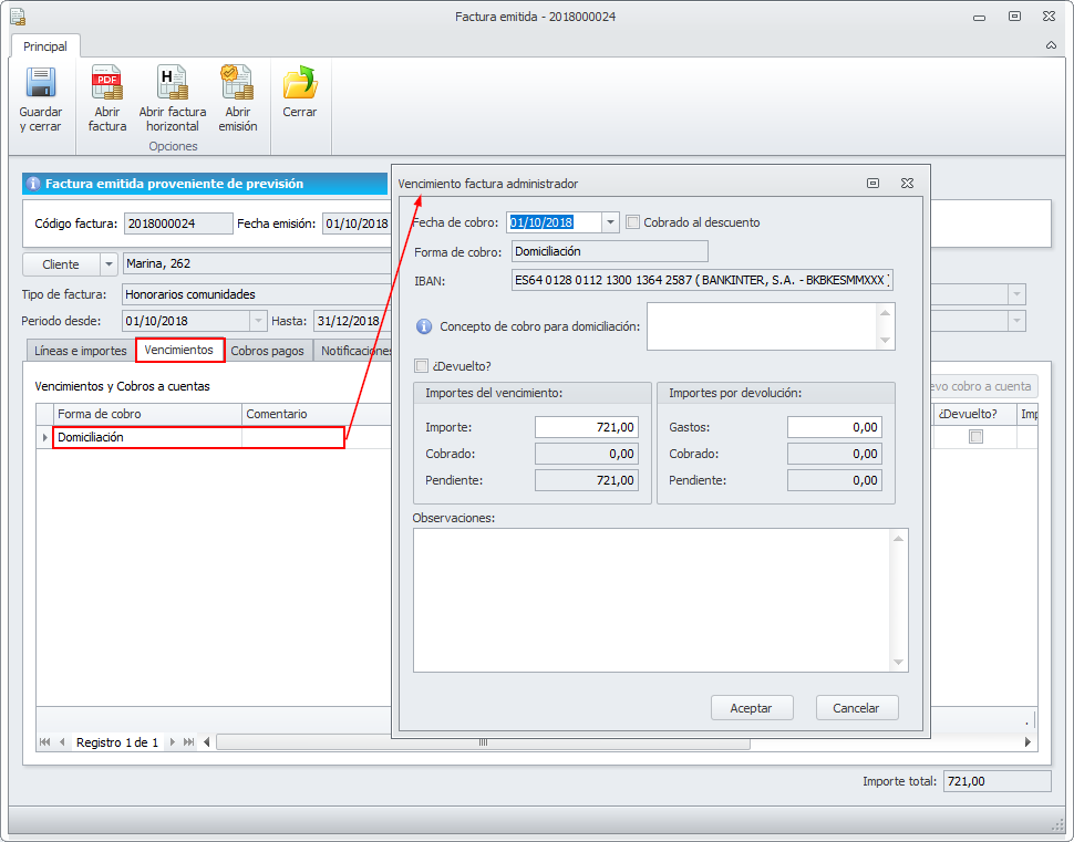 Cuando se hace doble clic sobre una línea para acceder a un vencimiento, se abre la factura a la que corresponde y la ficha del vencimiento escogido.