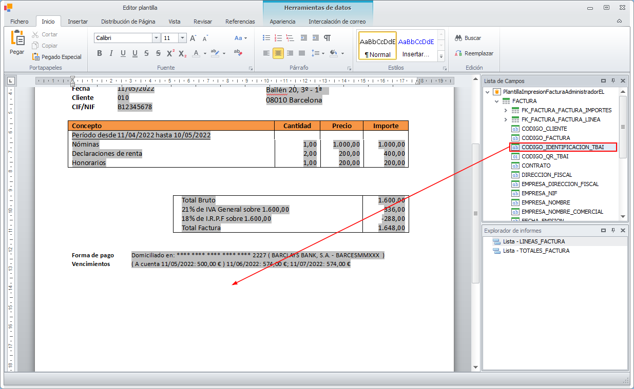 Lo más habitual es añadir estos dos campos, centrados, al final de la factura, quedando la plantilla como se ve a continuación.