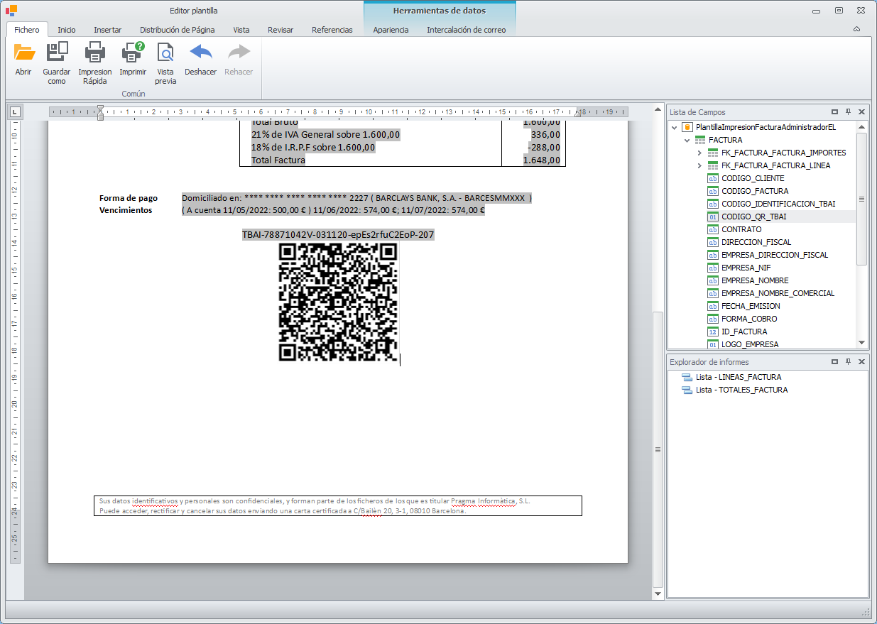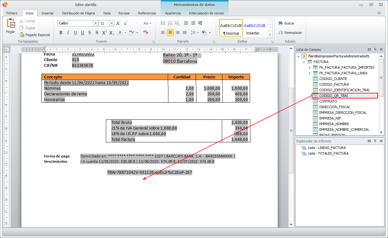 Añadir código identificativo y código QR en plantilla de factura para el sistema TicketBai