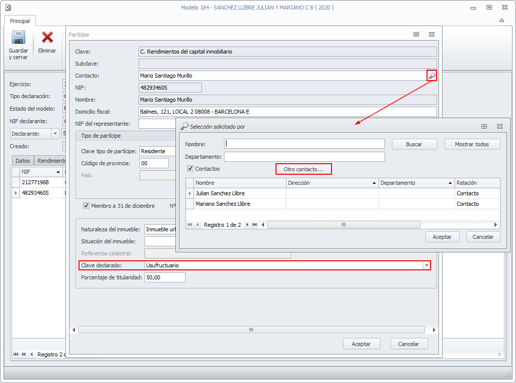 En ocasiones, la persona que percibe un rendimiento de una comunidad de propietario o una comunidad de bienes, no es directamente el propietario, sino otra persona, como por ejemplo, el inquilino del inmueble. En este caso debe identificarse como "usufructuario". Para ello, tras la importación de los partícipes, se debe: