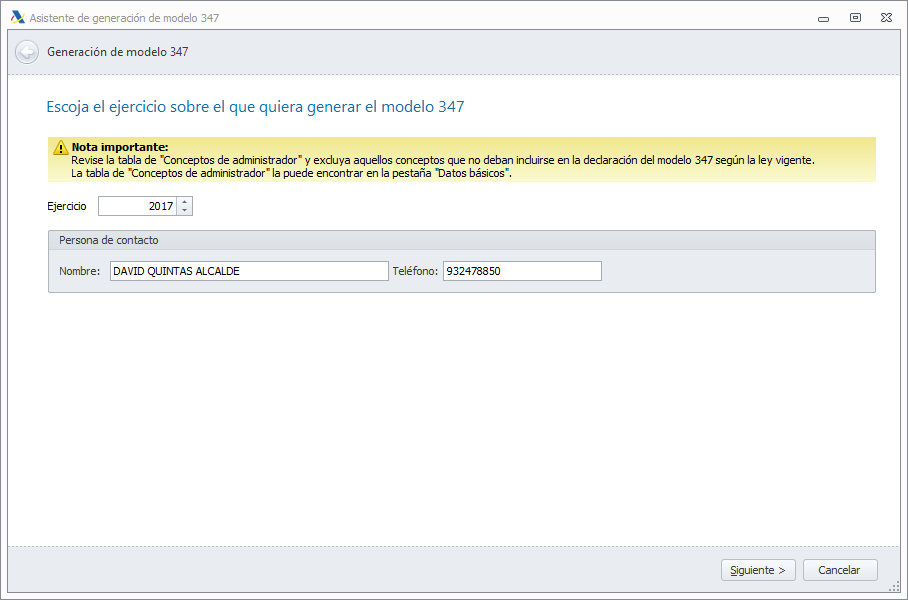 El asistente para generar el modelo 347 muestra diversas ventanas con los datos que se van a incluir.
