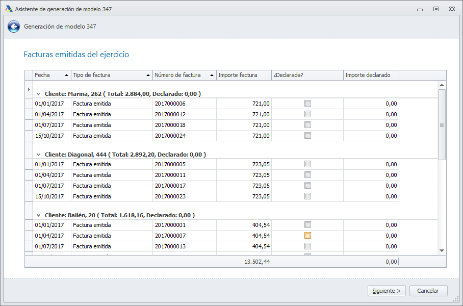 La siguiente ventana muestra las Facturas emitidas del ejercicio. Incluye las facturas que no han sido incluidas todavía en un modelo 347 cuya fecha de expedición: