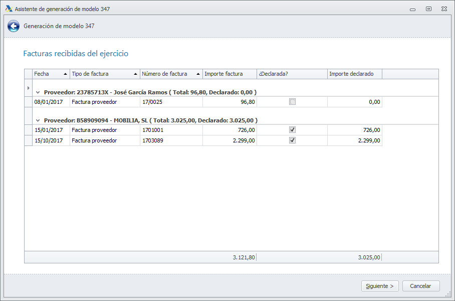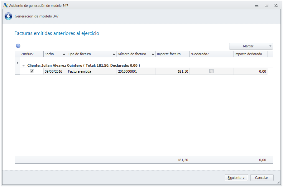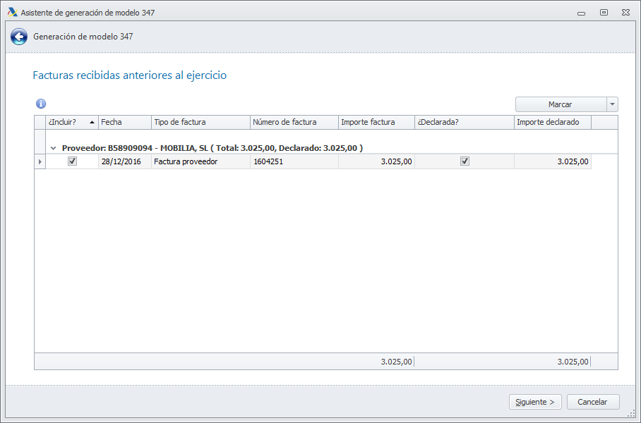 Por defecto muestra las facturas como seleccionadas para declarar en el modelo que se está generando. Puede desmarcarlas si no desea que se incluyan.