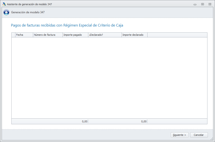 Por último, muestra los Pagos de facturas recibidas con Régimen Especial de Criterio de Caja. Incluye los pagos realizados de facturas sujetas a criterio de caja que no han sido incluidos todavía en un modelo 347, cuya fecha de pago: