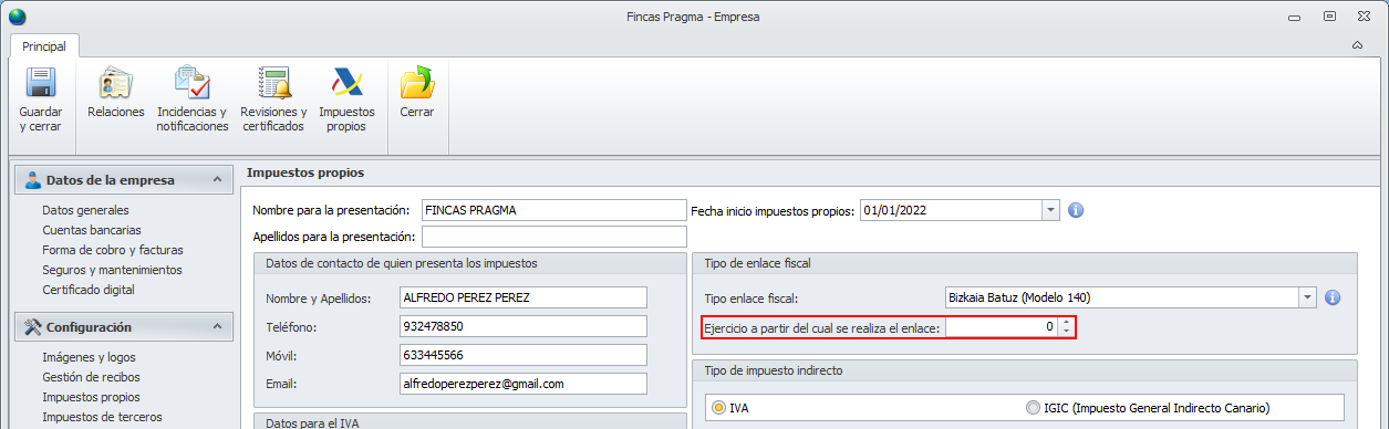 Tras activar el tipo de enlace fiscal debe indicarse el ejercicio a partir del cual debe iniciarse la presentación. De este modo las facturas de ejercicios anteriores quedan excluidas del proceso.