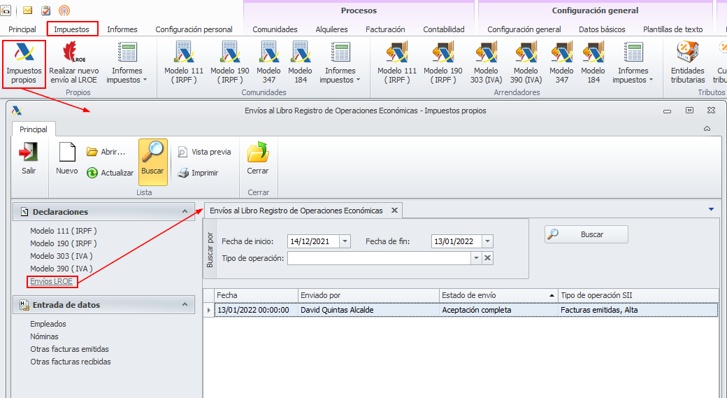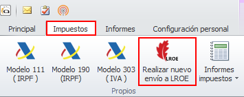 En el menú Impuestos puede ver un botón Realizar nuevo envío al LROE.