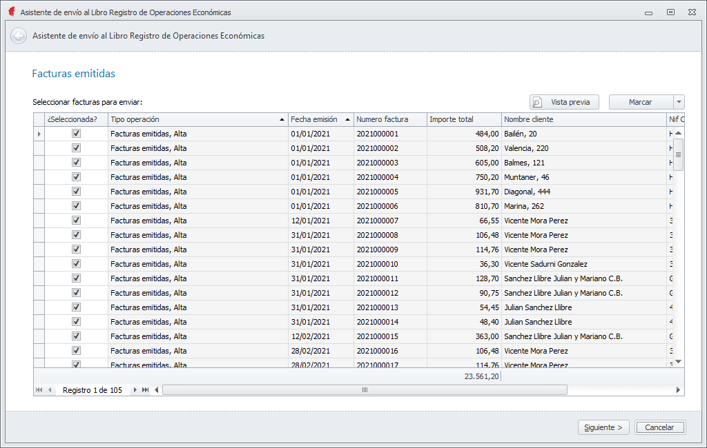 Al hacer clic en este botón, se abre un asistente para la cumplimentación del envío. En primer lugar muestra una lista de las facturas emitidas que se van a incluir. Son las facturas del mismo ejercicio indicado en la ficha de Empresa y posteriores que todavía no han sido informadas. Permite realizar la exclusión de alguna si se desea omitir por el momento.