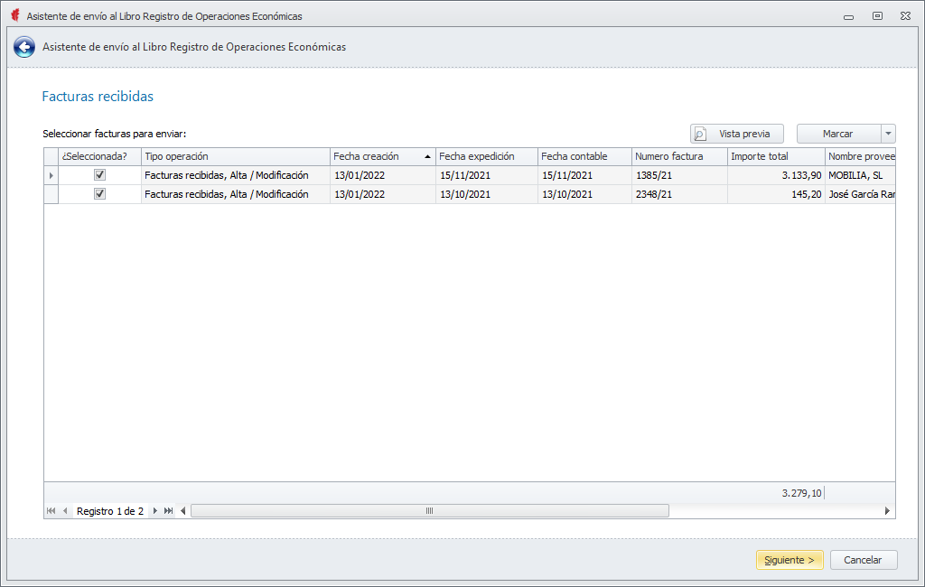 A continuación, muestra una lista de las facturas recibidas que se van a incluir. Son las facturas del mismo ejercicio indicado en la ficha de Empresa y posteriores que todavía no han sido informadas. Permite realizar la exclusión de alguna si se desea omitir por el momento.