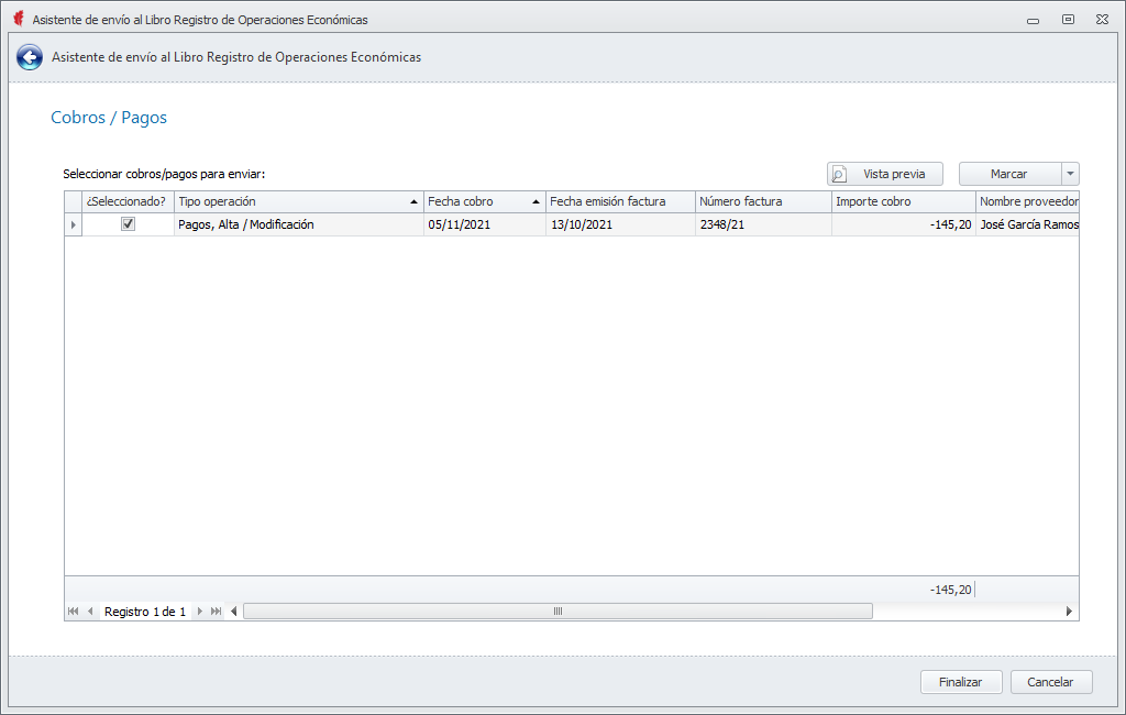 Por último, muestra una lista con los pagos de facturas adscritas al Régimen Especial de Criterio de Caja (RECC) que se van a incluir. Son los pagos del mismo ejercicio indicado en la ficha de Empresa y posteriores que todavía no han sido informados. Permite realizar la exclusión de alguno si se desea omitir por el momento.