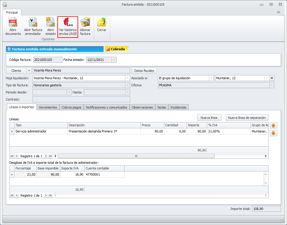 Las facturas recibidas, las facturas emitidas y los pagos del administrador correspondientes a facturas adscritas al Régimen Especial de Criterio de Caja (RECC) añaden a su ficha un botón que permite consultar el envío realizado al LROE en que se ha incluido esa operación.
