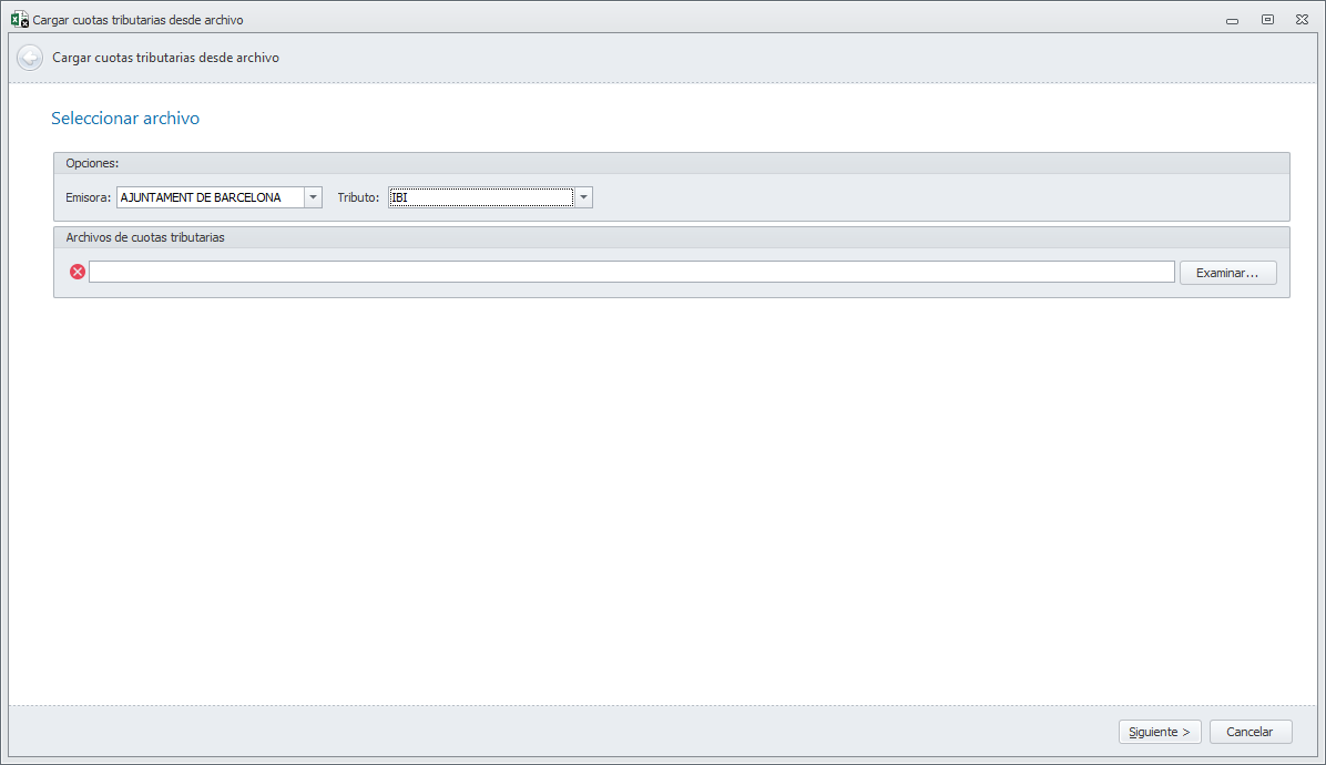 Al hacer clic sobre él, se abre un asistente que solicita el tipo de tributo y la localización del archivo que contiene la lista de cuotas facilitada por Caixabank en formato excel. Este archivo debe ser descargado desde la Plataforma de Gestión de Tributos (PGT) de Caixabank.