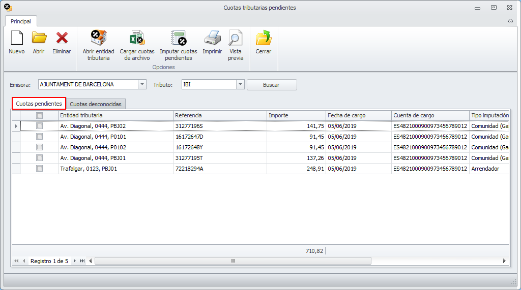 En la pestaña Cuotas pendientes se sitúan las cuotas correspondientes a las cuotas de entidades conocidas.