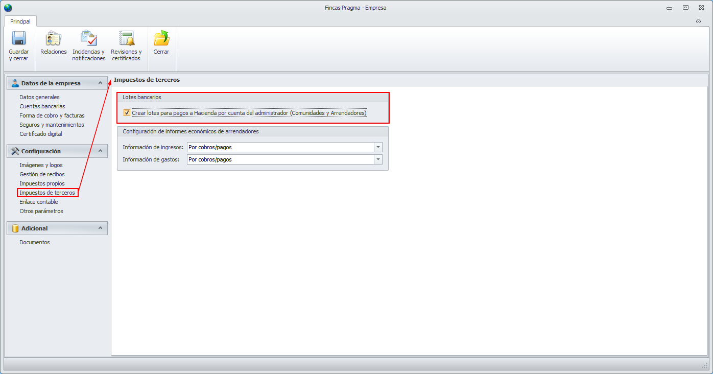 Adminet permite al administrador la presentación de autoliquidaciones por lotes, activando la casilla Crear lotes para pagos a Hacienda por cuenta del administrador (Comunidades Y Arrendadores) en la sección Impuestos de terceros de la ficha de Empresa, como puede verse a continuación.