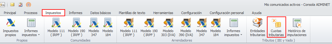 Desde adminet, acceda al menú Impuestos y haga clic en el botón Cuotas tributarias.
