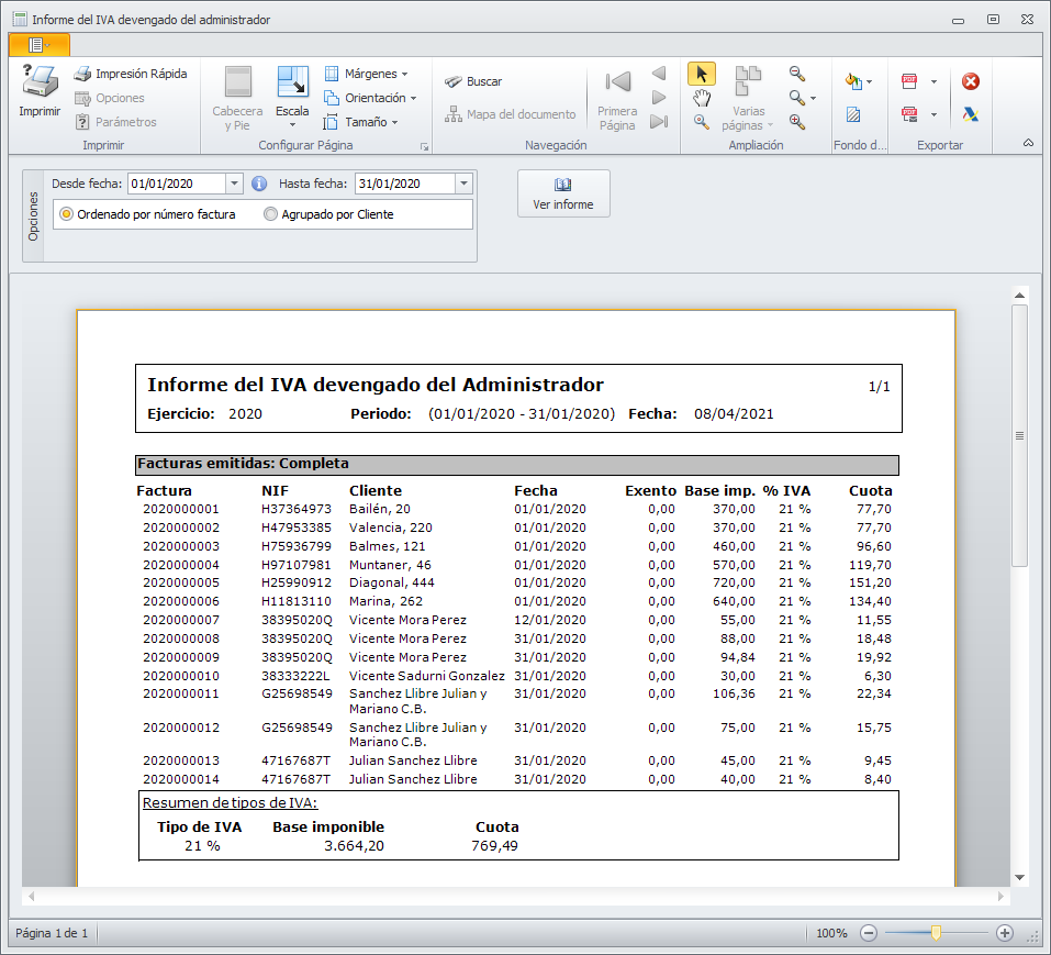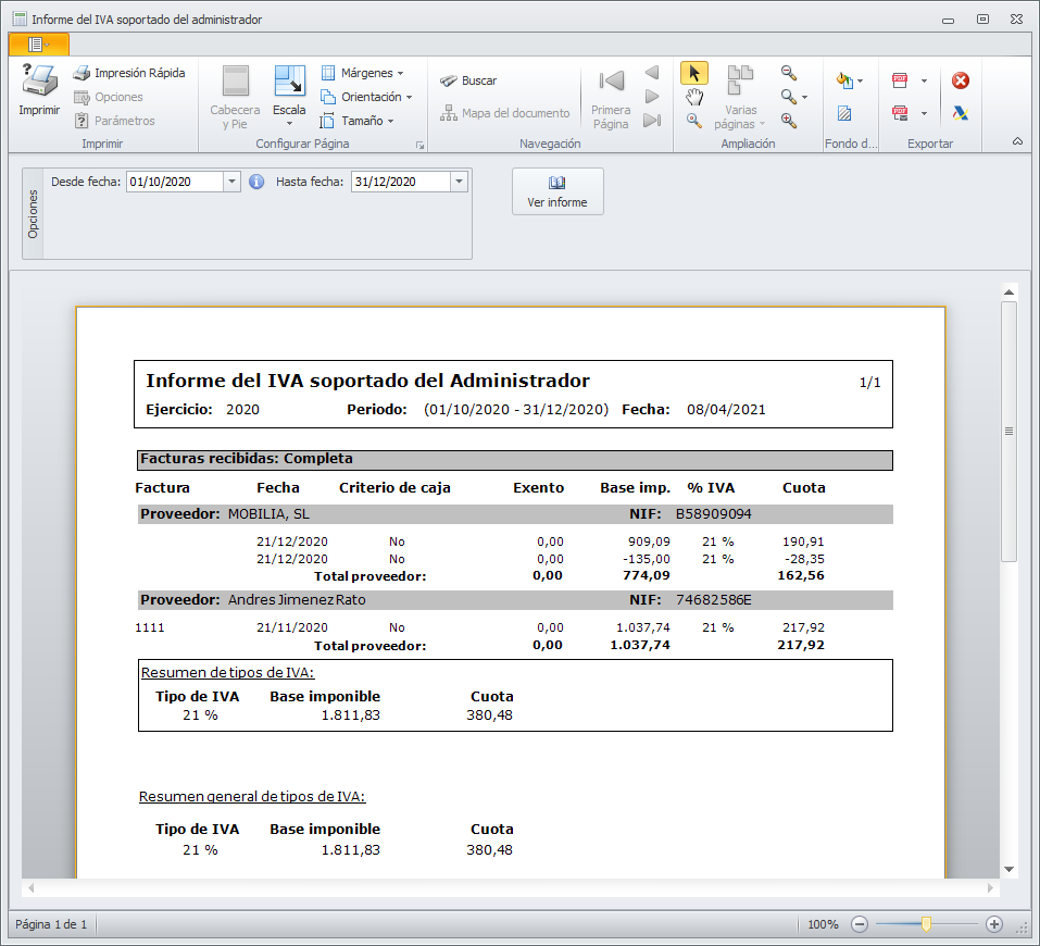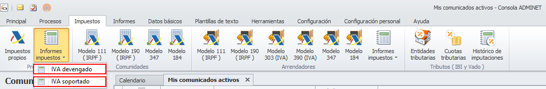 Los informes de IVA Devengado e IVA Soportado del administrador se obtienen desde el menú Impuestos.