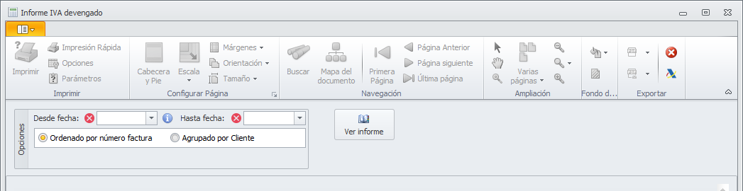 Al hacer clic sobre el botón Ver informe (IVA devengado) se abre la siguiente ventana, en la que se puede escoger las fechas a mostrar en el informe.
