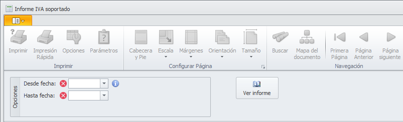 Al hacer clic sobre el botón Ver informe (IVA soportado) se abre la siguiente ventana, en la que se puede escoger las fechas a mostrar en el informe.