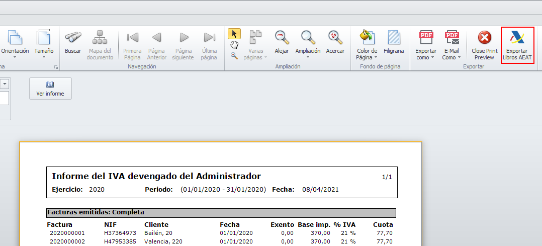 En la barra de botones de la ventana de ambos informes, puede ver, en su parte derecha un botón Exportar libros AEAT, que sirve para exportarlo al formato de la AEAT. Haga clic aquí para obtener más información.