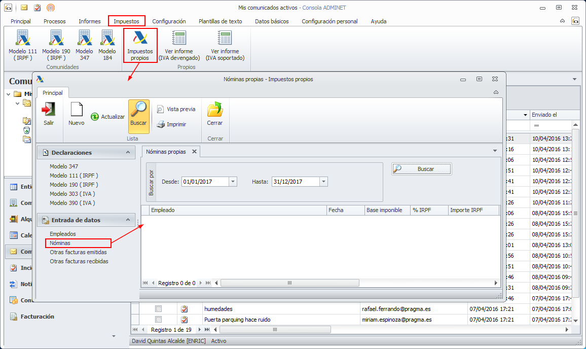 Para las retenciones de IRPF que el administrador aplica a sus empleados en sus hojas de nómina, estas deben ser informadas accediendo a la sección Nóminas del botón Impuestos propios del menú Impuestos.
