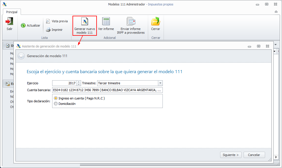 La generación de un nuevo modelo se realiza desde la opción Generar nuevo modelo 111. Se abre un asistente que nos guía en el proceso de generación del nuevo modelo. Se escoge el periodo, la cuenta desde la que se realizará el pago y la forma de pago deseada.