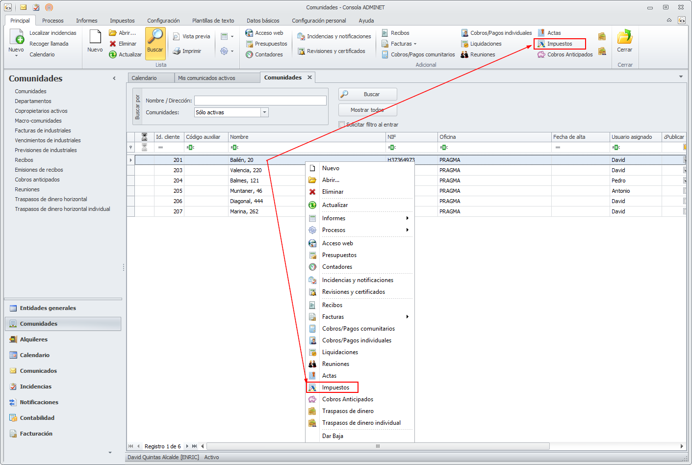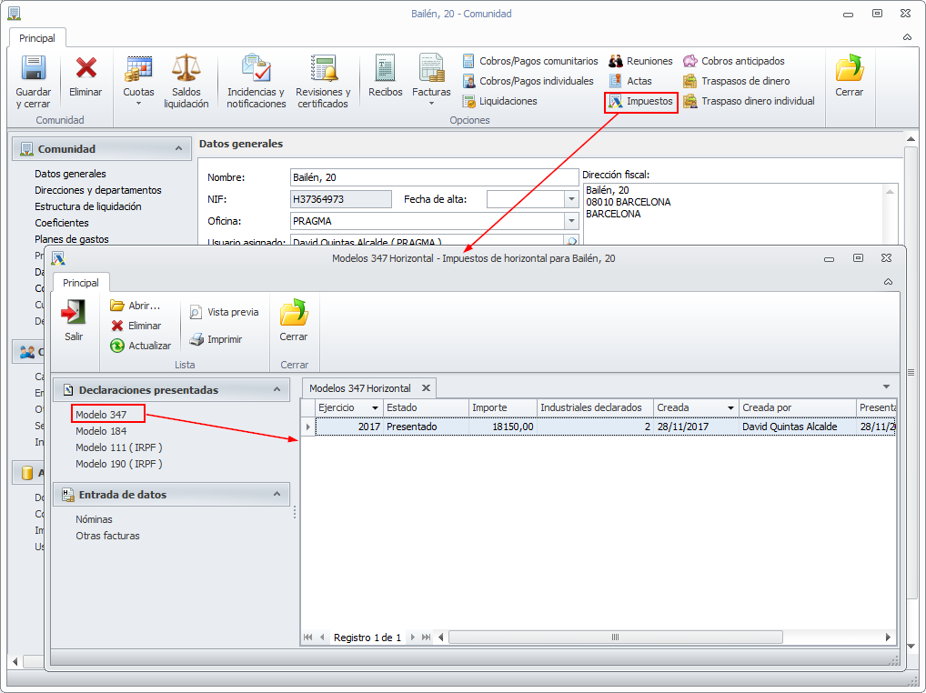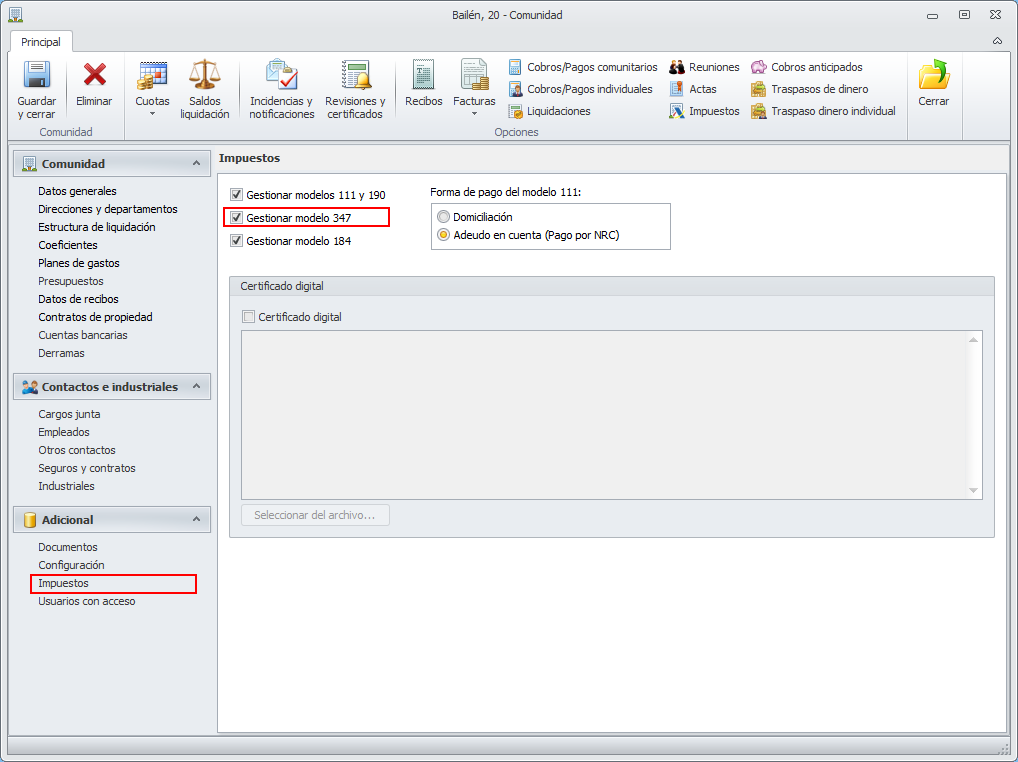 Si debe presentar el modelo 347 de una comunidad, abra su ficha y vaya a la sección Impuestos. Marque la casilla Gestionar modelo 347.