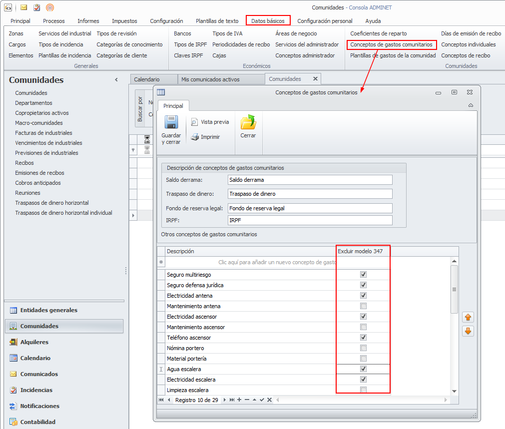 Tenga en cuenta que las comunidades de propietarios deben excluir de la declaración del modelo 347 las operaciones relacionadas con seguros y los consumos de agua y electricidad y combustibles. Por lo tanto, debe revisar la tabla de Conceptos de gastos comunitarios en el menú Datos básicos y excluir aquellos conceptos que no deban incluirse en la declaración del modelo 347 según la ley vigente.