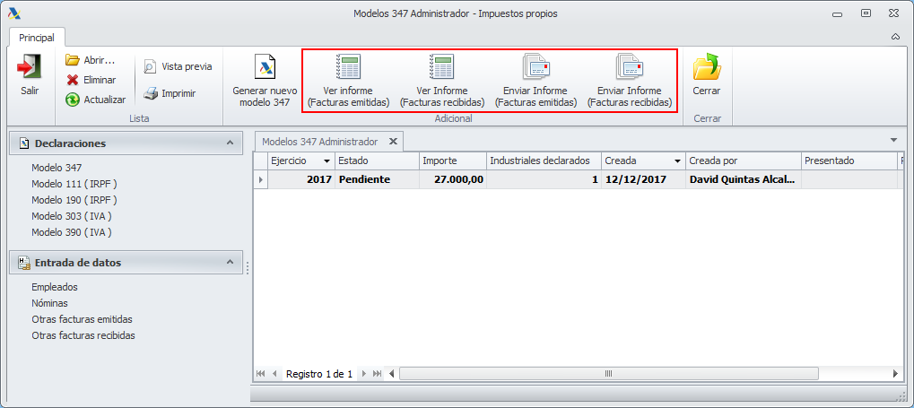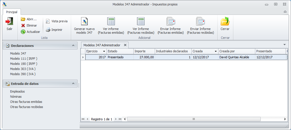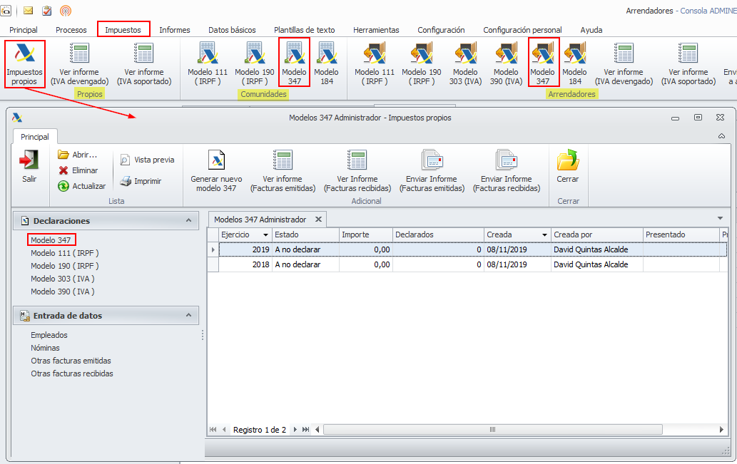 En el caso del administrador, para consultar el modelo 347 debe accederse a la misma ventana desde la que se gestiona toda la preparación y presentación del modelo.