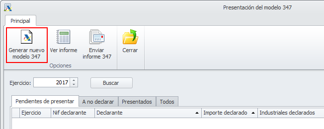 La generación de un nuevo modelo se realiza desde la opción Generar nuevo modelo 347. El asistente le guiará durante el proceso. En el caso de comunidades y arrendadores, pueden generarse de uno en uno o todos a la vez.