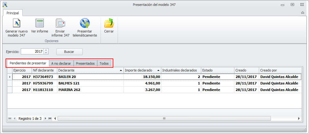 En comunidades y arrendadores, los modelos generados aparecen automáticamente en el formulario de presentación de modelo 347, que contiene cuatro pestañas, la primera contiene los modelos pendientes de presentar, la segunda, contiene aquellos modelos que no son necesarios presentar (a no declarar) pues no llegan al importe mínimo requerido por hacienda. En la pestaña Presentados vemos los modelos que ya han sido presentados a hacienda y en la última pestaña los vemos Todos.