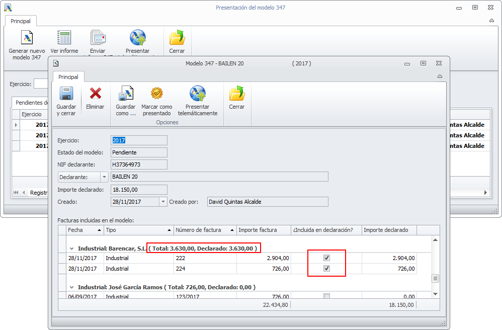 Haciendo doble clic sobre una línea de cualquiera de las cuatro listas, se abre la ficha de ese modelo 347. En esta ficha se detallan los datos incluidos en el modelo 347 y se detallan sus facturas vinculadas, indicando si ha sido incluida para su declaración o no. Es importante recordar que si la suma de las facturas de un industrial o proveedor no llegan al importe mínimo (3.005,06€) éste no debe ser incluido en la declaración. Tampoco se deben presentar las facturas que tengan retención a cuenta del I.R.P.F.