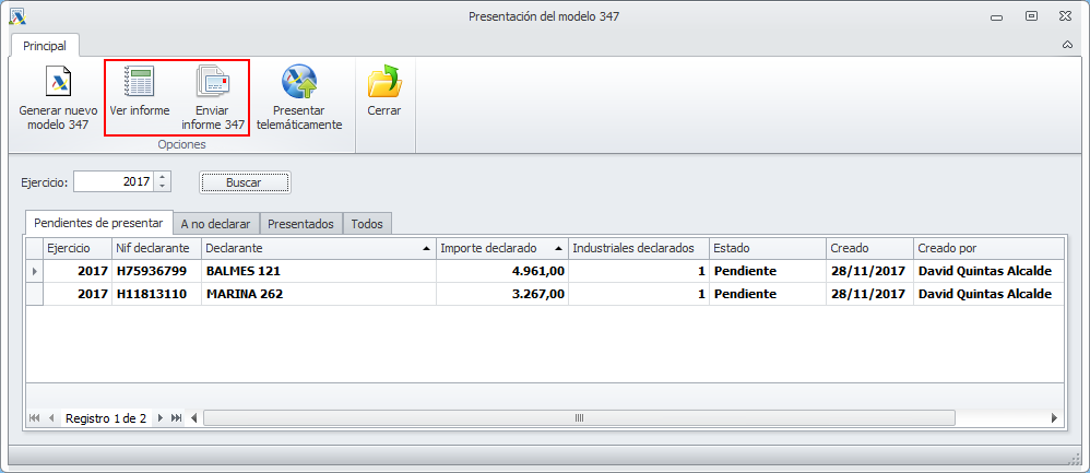 El botón Ver informe permite visualizar la información incluida en los modelos 347 de cada una de los declarantes. Se emplea para la verificación de datos.