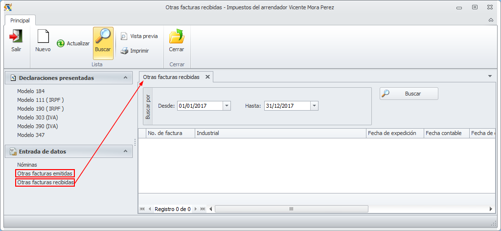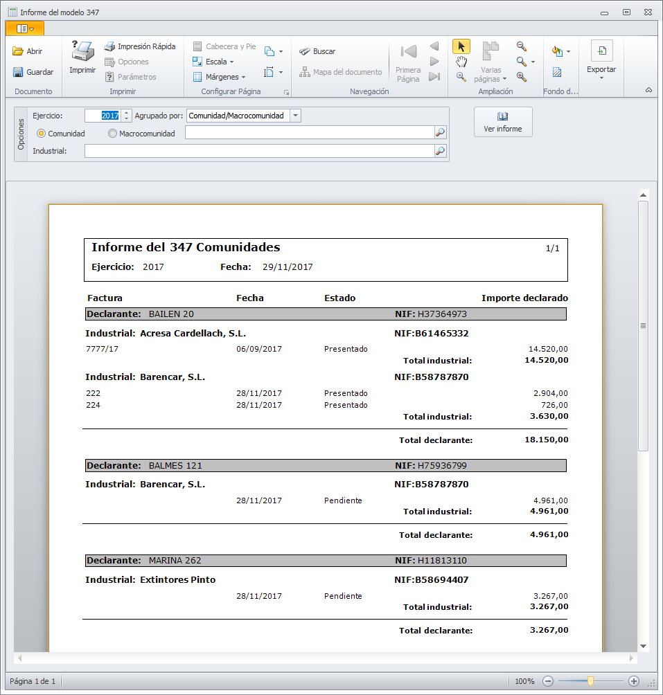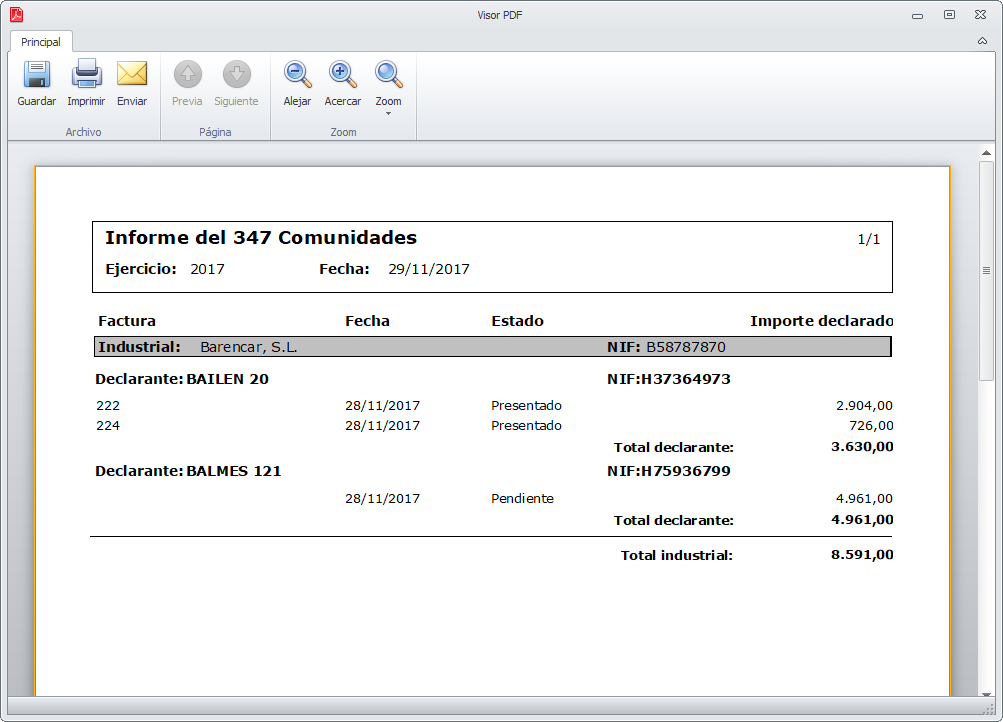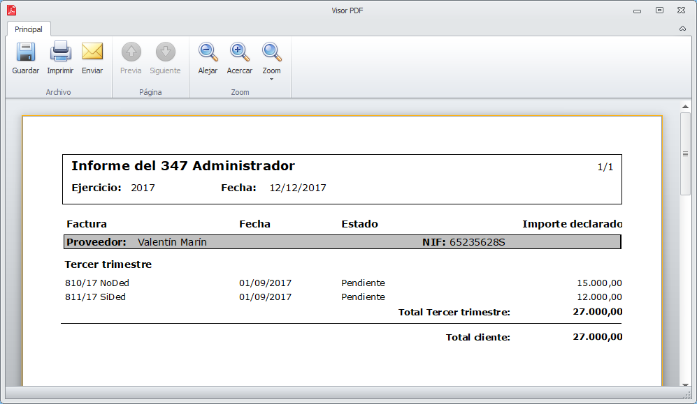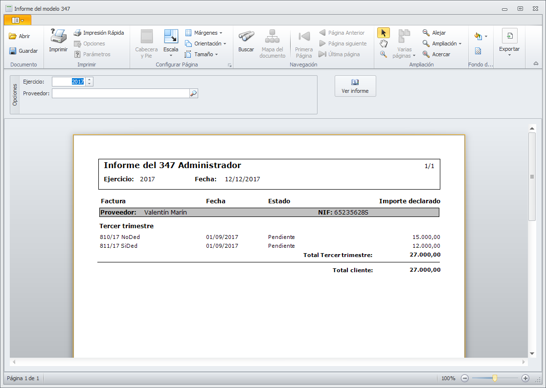 Los botones Ver informe (Facturas emitidas) y Ver informe (Facturas recibidas) permiten visualizar la información incluida en el modelo 347. Se emplea para la verificación de datos. A continuación vemos un ejemplo del informe de facturas recibidas.